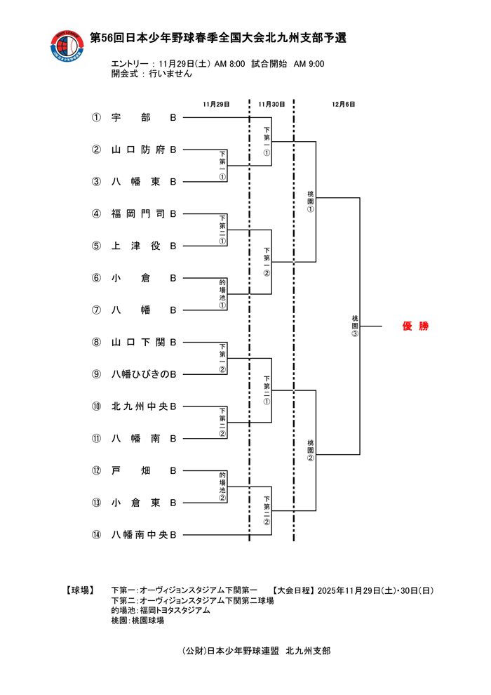 11/29・30・12/6 第56回日本少年野球春季全国大会北九州支部予選 ■ 大会日程:2025年11月29日(土曜)・30日(知曜)・12月5日(土曜) 予備日:00日(曜) ■ エントリー:11月29日(土曜)AM 8:00 ■ 開会式:行いません ■ 主管:(公財)日本少年野連盟北九州支部 印刷用トーナメントシート By secretariat | 2025年11月14日 | 公式戦2025 | ← 11/15・16 第13回日本少年野球長﨑傳記念大会 第7回日本少年野球本田正記念大会 →