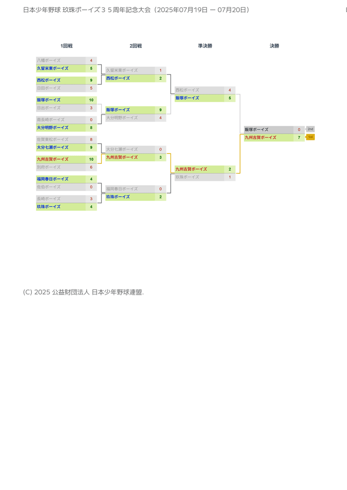 7/19・20 日本少年野球玖珠ボーイズ35周年記念大会 ■ 大会日程:2025年7月19日(土曜)・20日(日曜) ■ 主管:(公財)日本少年野球連盟大分県支部 玖珠ボーイズ 北九州支部からは、八幡ボーイズが出場しました。 印刷用トーナメントシート By secretariat | 2025年8月11日 | 公式戦2025 | ← 7/19・20・21 第19回日本少年野球宮崎大会 8/2・3・9 第50回西日本新聞社杯少年硬式野球夏季西九州大会2025 →
